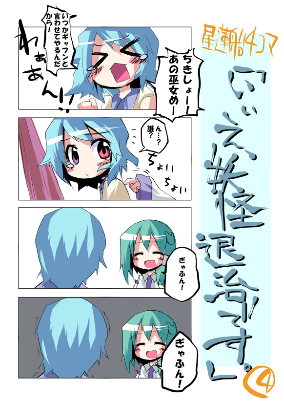 1boy4komablue hairbullyingclosed eyescomicfemale focusgreen hairheterochromiapurple eyesred eyestrembling