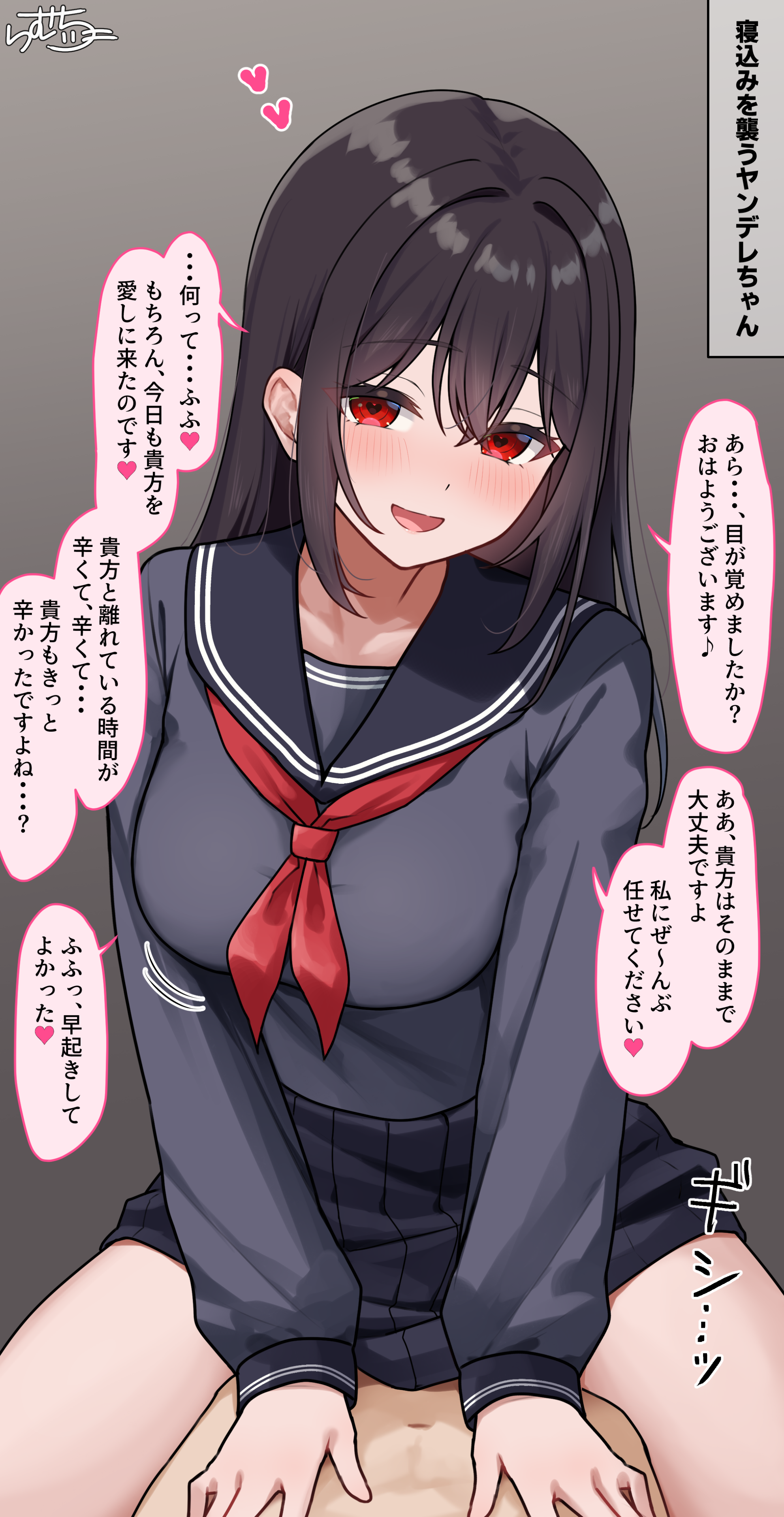 1boy1girlarm supportblack hairblushgirl on topheartheart-shaped pupilslong hairlooking at viewermotion linesneckerchiefpleated skirtred neckerchiefsailor collarschool uniformsimple backgroundskirtspeech bubblespoken heartstraddlingsymbol-shaped pupils