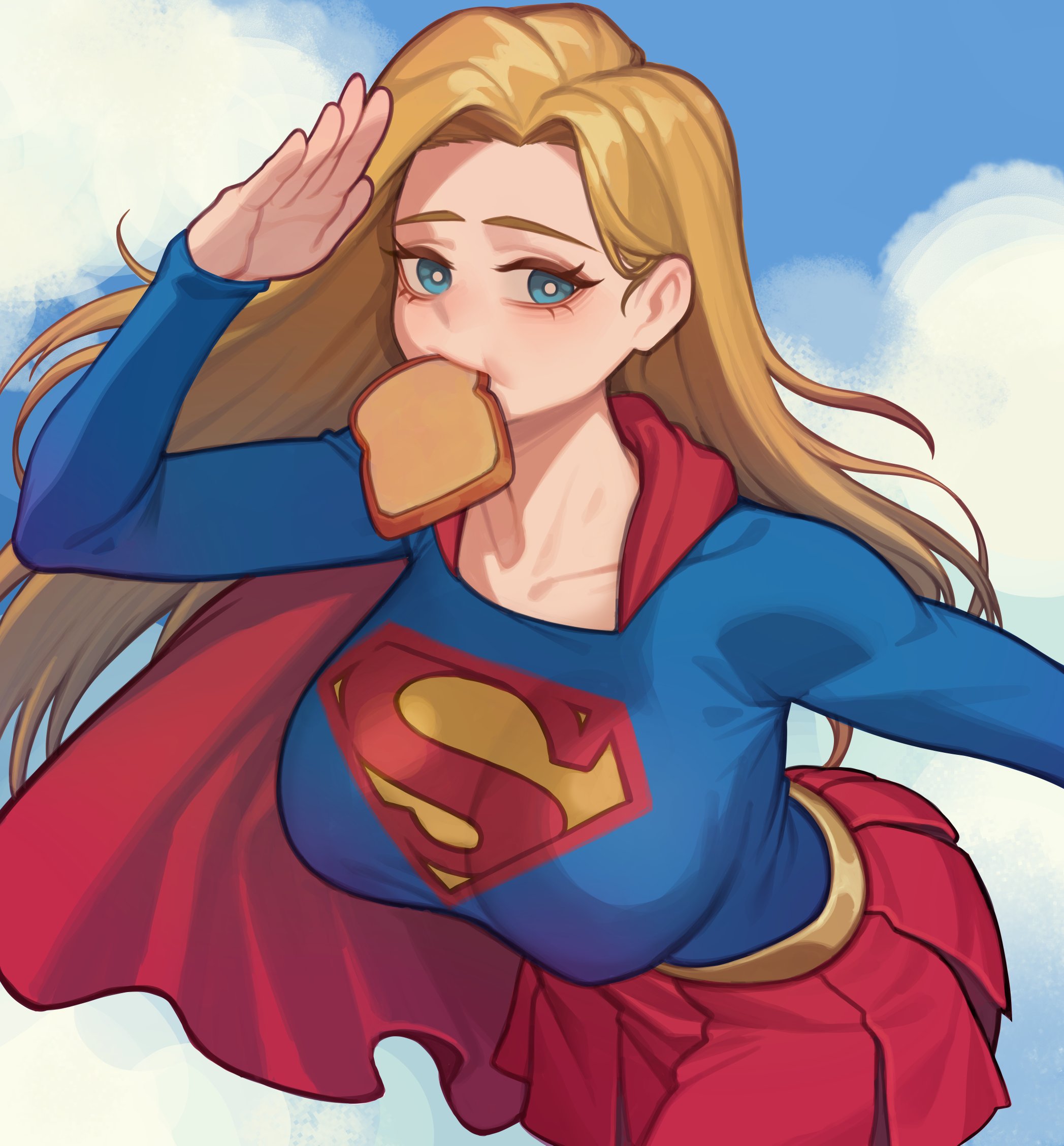 1girlblonde hairblue eyesbreadbreastscapefoodlarge breastslong hairlong sleeveslooking at viewerred capeskirtsolosuperhero costume