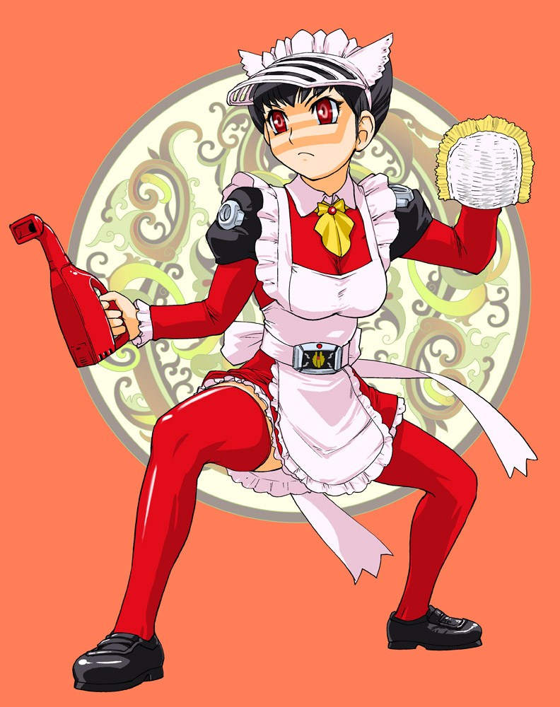 1girlapronblack hairfemale focusfull bodyhairbandmaidmaid apronred eyesshort hairsolostandingthighhighs