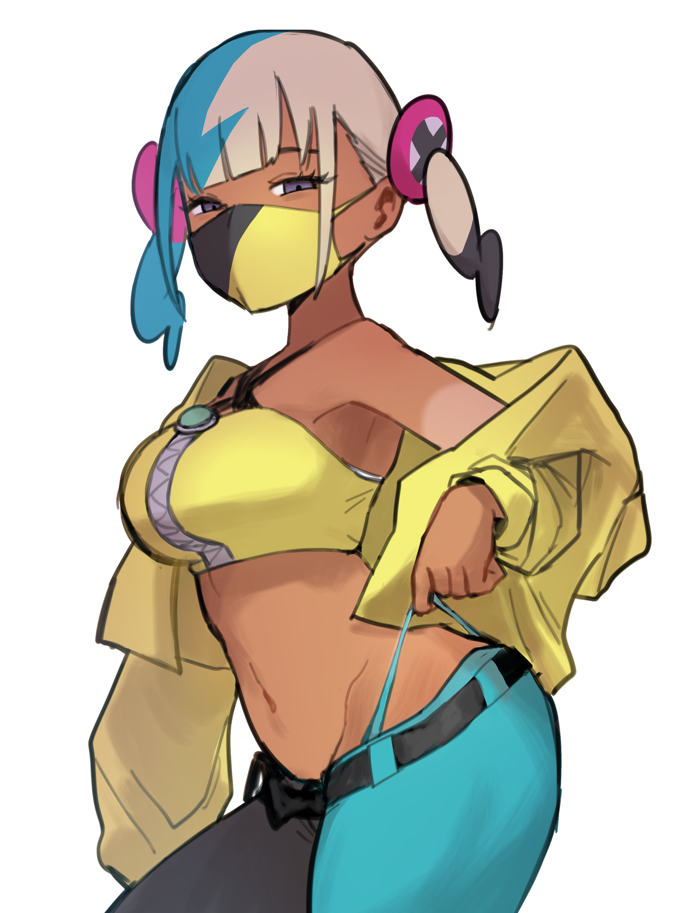1girlbeltblack beltblunt bangseyelashesgrey eyeshalf-closed eyesjacketlooking at viewermaskmouth maskmulticolored hairnavelopen clothesopen jacketpantssimple backgroundsingle off shouldersolostomachui (chikoyore)white backgroundyellow jacketzipperzipper pull tab