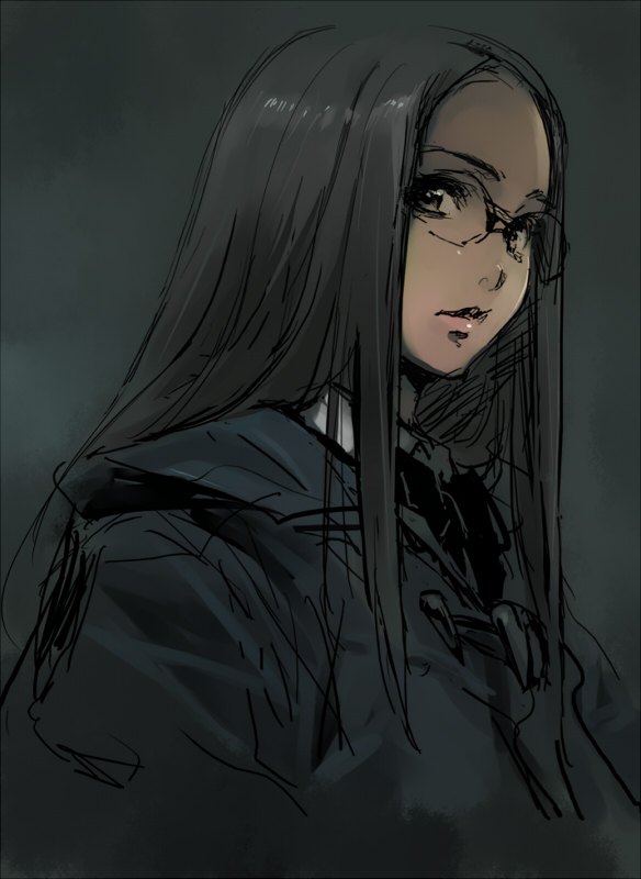 1girlblack hairbrown eyescoatdarkfemale focusforeheadglasseslipslong hairsolotogglesupper body