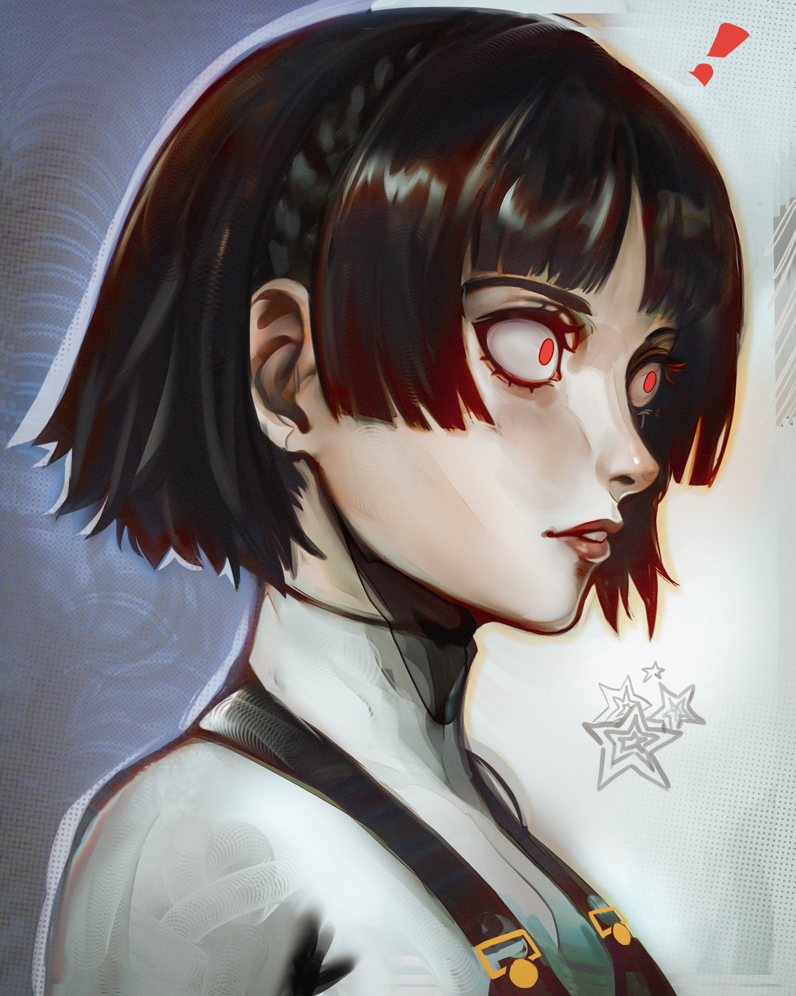 tsubu (kappunioyu562), tsumugi kokage, vspo!, highres, translated, 1girl, black choker, blue hair, blue hoodie, choker, closed eyes, drawstring, facing viewer, flower hairpin, gradient hair, grin, hair flaps, hair intakes, hood, hoodie, medium hair, multicolored hair, overalls, portrait, simple background, smile, solo, strap slip, tied drawstring, virtual youtuber, water drop hair ornament, white background, white overalls