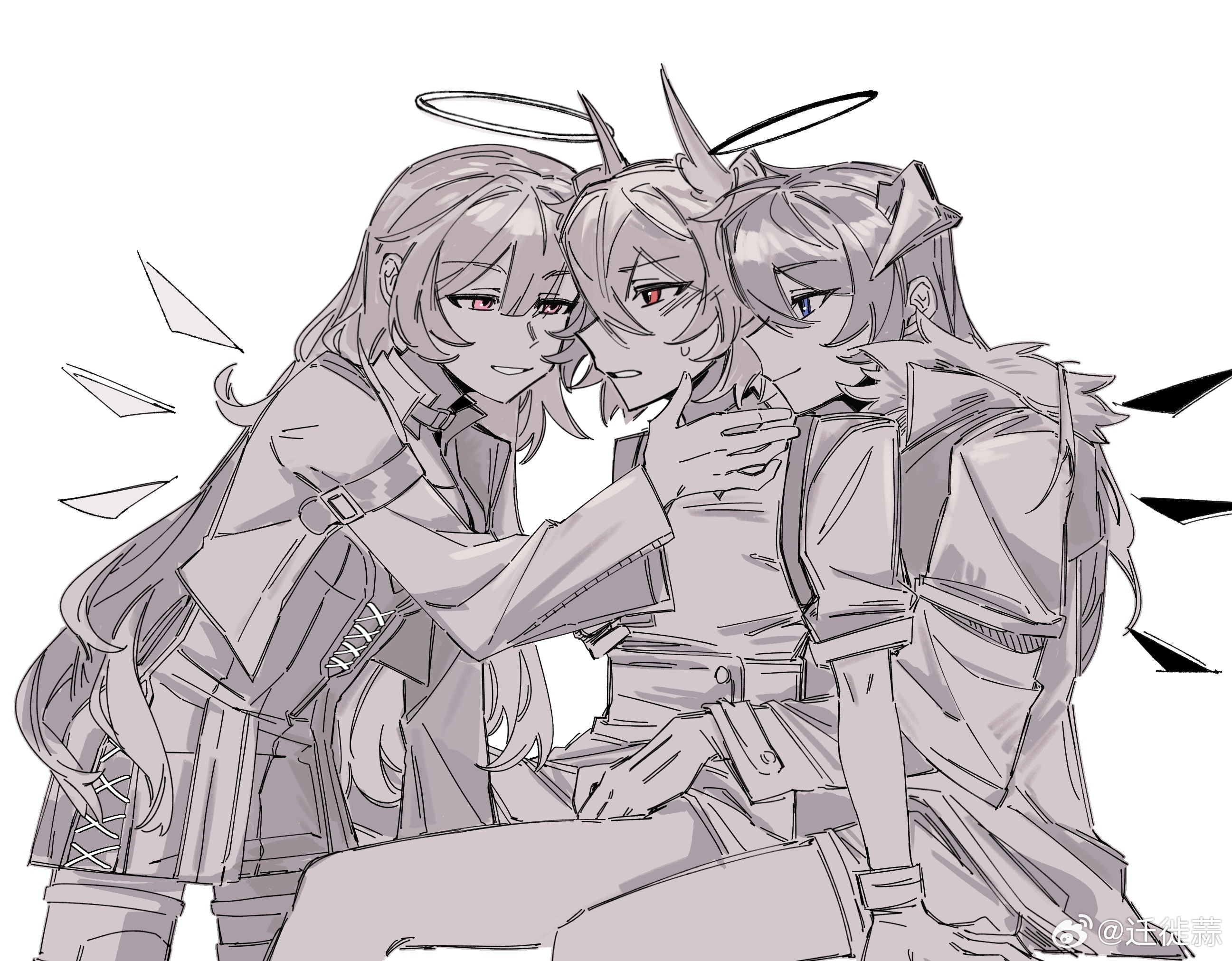 3girlsblue eyesgreyscalehalohand on another's cheekhand on another's facehead wingshornsjacketlong hairlooking at anothermonochromemultiple girlspink eyesred eyesshirtshort sleevessimple backgroundspot colorsweatdropwhite backgroundwingsyuri