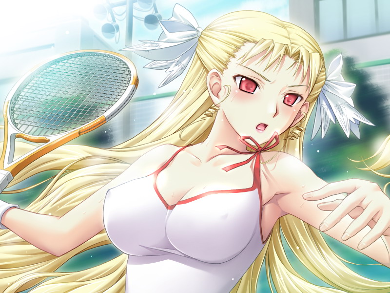 1girlblonde hairbreastscleavagecovered erect nipplesfemale focuslarge breastslong hairracketred eyessolosportswearsweattennis rackettennis uniform