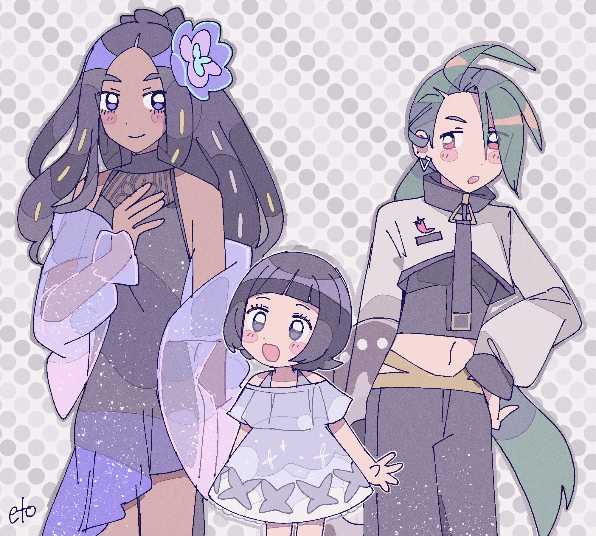 :d:o3girlsalternate costumebare shouldersblack dressblack hairblack necktieblack pantsblack shirtblush stickerscrop topdark skindark-skinned femaledressflowergreen hairgrey backgroundgrey dressgrey eyeshair flowerhair ornamentjacketjacket partially removedlong hairlooking at anothermultiple girlsnavelnecktieoff shoulderopen mouthpantsponytailpurple eyespurple flowerpurple jacketsee-through clothessee-through jacketshirtshrug (clothing)simple backgroundsleevelesssleeveless dresssmilestandingupper bodywhite shrug