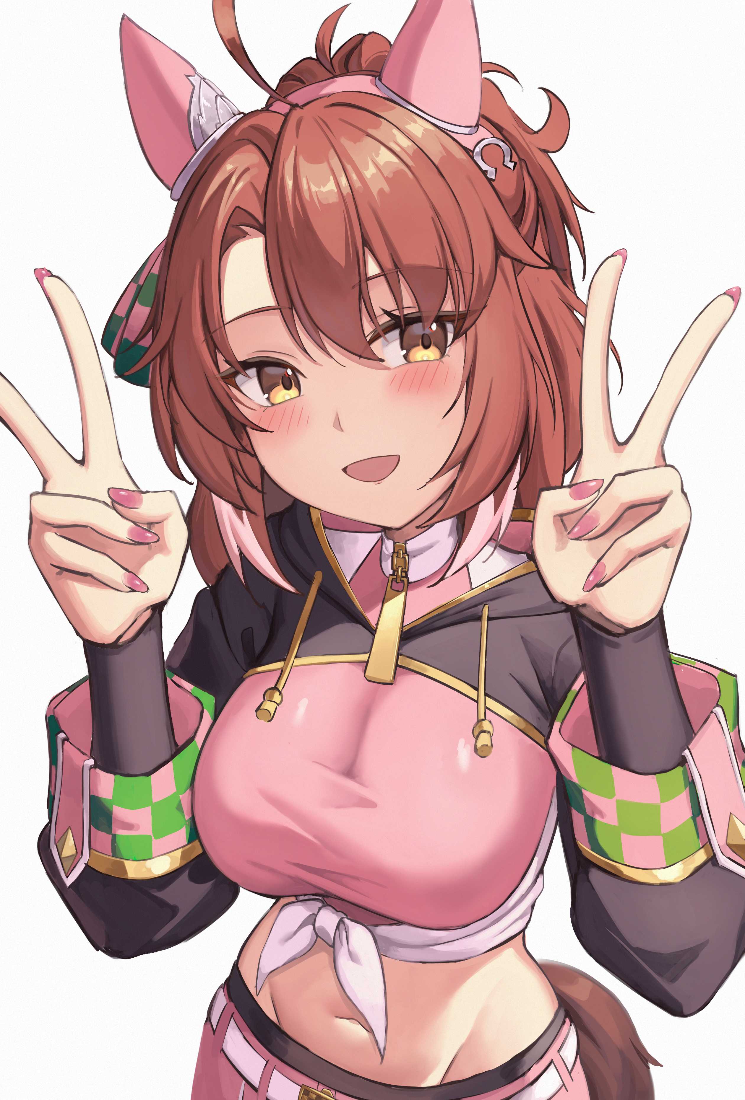 1girlahogeanimal earsbeltblack leggingsblack shrugblushbowbreastsbrown eyesbrown haircheckered ribbondouble vear coversear ornamentear ribbonhair between eyeshorse earshorse girlhorse taillarge breastsleggingsleggings under shortslooking at viewermidriffmulticolored hairnavelopen mouthpink nailspink shirtpink shortsshirtshortsshrug (clothing)simple backgroundsmilesolotailtied shirtvwhite backgroundwhite beltwhite hairwhite shirt