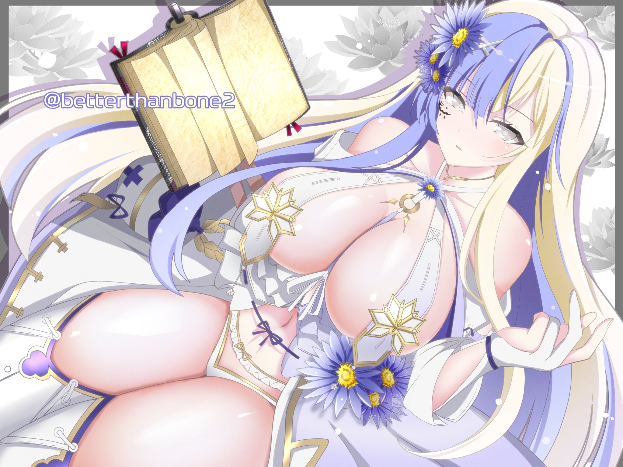 1girlblonde hairbookbreast curtainsbreastscleavageeye tattoofacial tattooflower braglovesgrimoirehair ornamenthairpinlarge breastslong hairlooking at viewermulticolored hairmultiple hairpinsnavelpartially fingerless glovespurple hairpurple petalsribbon-trimmed gartersolotattootwo-tone hairwhite eyes
