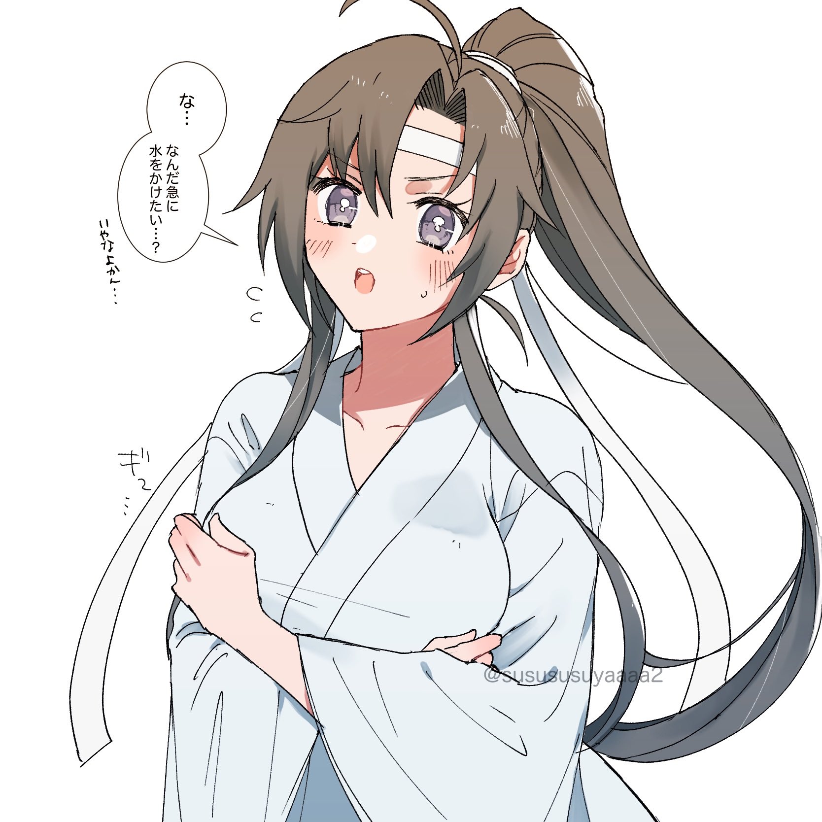 :o1girlahogealternate costumeblack hairblushborrowed clothesbreastsbrown hairchinese clothescollarbonecrossed armsflying sweatdropsgenderswapgenderswap (mtf)grey eyeshair between eyeshair ribbonhanfuheadbandhigh ponytaillarge breastslong hairlong sleeveslooking at vieweropen mouthponytailpurple eyesribbonsidelockssimple backgroundsolospeech bubblesweatsweatdropteethtwitter usernameupper bodyupper teeth onlyv-shaped eyebrowsvery long hairwhite backgroundwhite hanfuwhite headbandwhite ribbonwide sleevesyaichi00