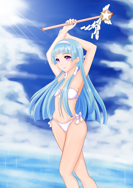 00s1girlbikiniblue hairblunt bangsdayfemale focushair tubeshairbandlong hairpurple eyessoloswimsuitwandwhite bikini