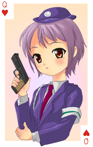 1girlarmbandblushbrown eyescardcard (medium)cosplayfemale focusgrey hairgunhandgunhatheartnecktiepistolplaying cardplaying card (medium)policepolice uniformpolicewomanpurple hairqueenqueen (playing card)queen of hearts (playing card)red eyesshort hairsoloweapon
