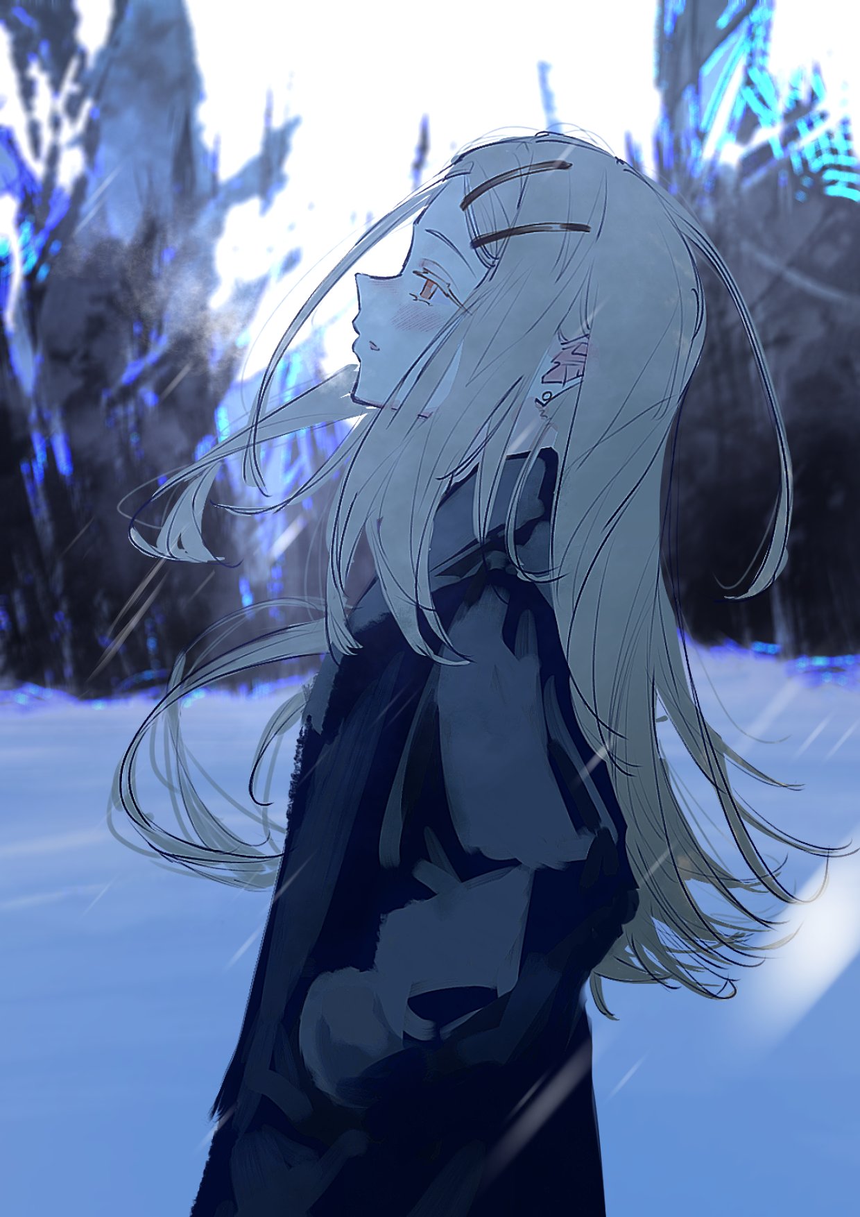1girlblack coatblushcoatcolored eyelashesearringsflipped hairfrom sidegrey hairhair ornamenthaircliphand in pocketjewelrylong hairlong sleeveslooking upnose blushorange eyesoutdoorsparallel hairclipsparted lipsprofilesnowsnowingsolostud earringsupper bodywinter