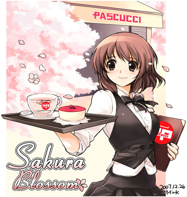 bowbowtiebrown eyesbrown haircherry blossomsfoodpetalspuddingrestaurantshort hairsolotreewaitresswind