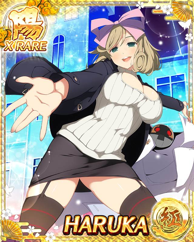 1girlblack jacketblack thighhighsblushbowbreastsbuildingcard (medium)cleavagecurly hairgarter strapsgreen eyeshair bowjacketlab coatlarge breastsopen mouthoutdoorspink bowreachingreaching towards viewerrobotsmilesnowflakessolosweaterthighhighs