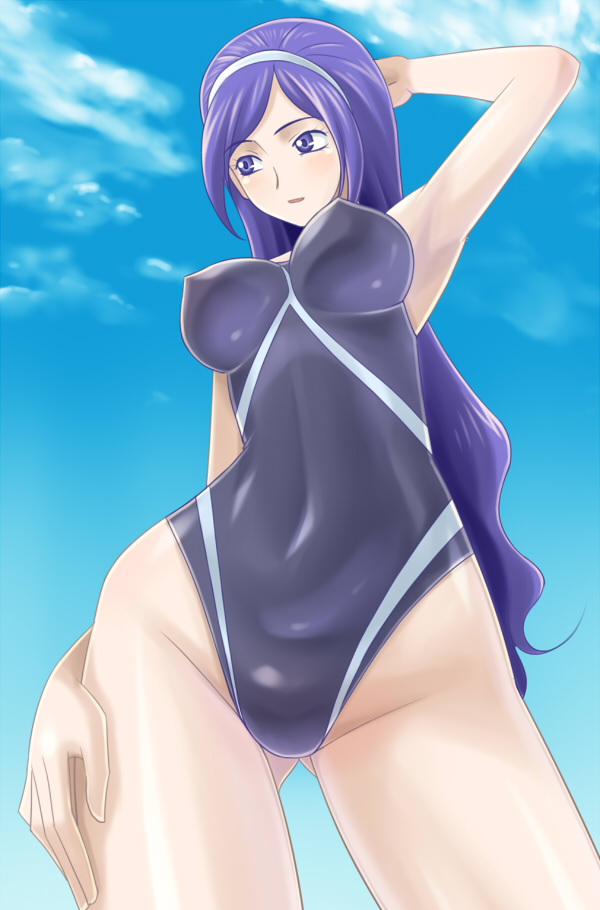 00s1girlarmpitsarms upblushcloudcompetition swimsuitdayfemale focusfrom belowhairbandlong hairone-piece swimsuitpurple eyespurple hairskysmilesolostandingswimsuitvery long hair