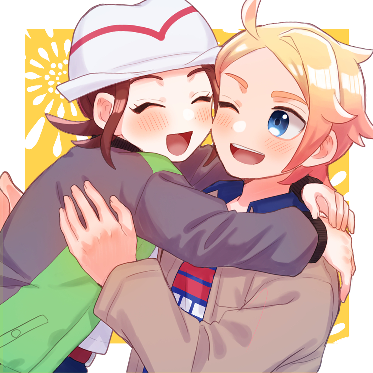 :d1boy1girlahogeblonde hairblue eyesblue shirtblushbrown hairbrown jacketclosed eyescollared shirteyelasheshappyhathugjacketlong sleeveslooking at anotherone eye closedopen mouthshirtsmileteethtongueupper teeth onlywhite hatyellow background