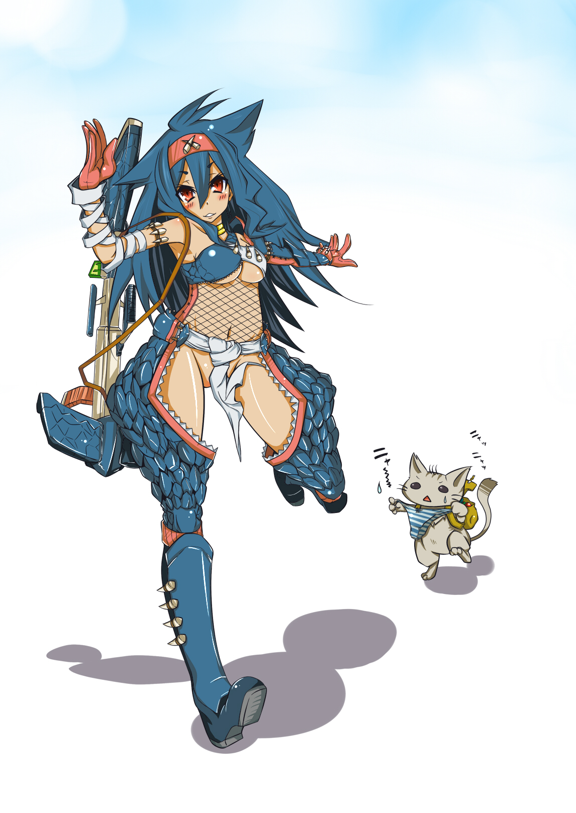 1girlanimalarmorbare shouldersblue hairblushbootsbreastscensoredcleavageconvenient censoringfishnetsglovesgunheadbandlong hairmedium breastsnargacuga (armor)navelno pantiespantiesred eyessmilestriped clothesstriped pantiesunderboobunderwearweapon