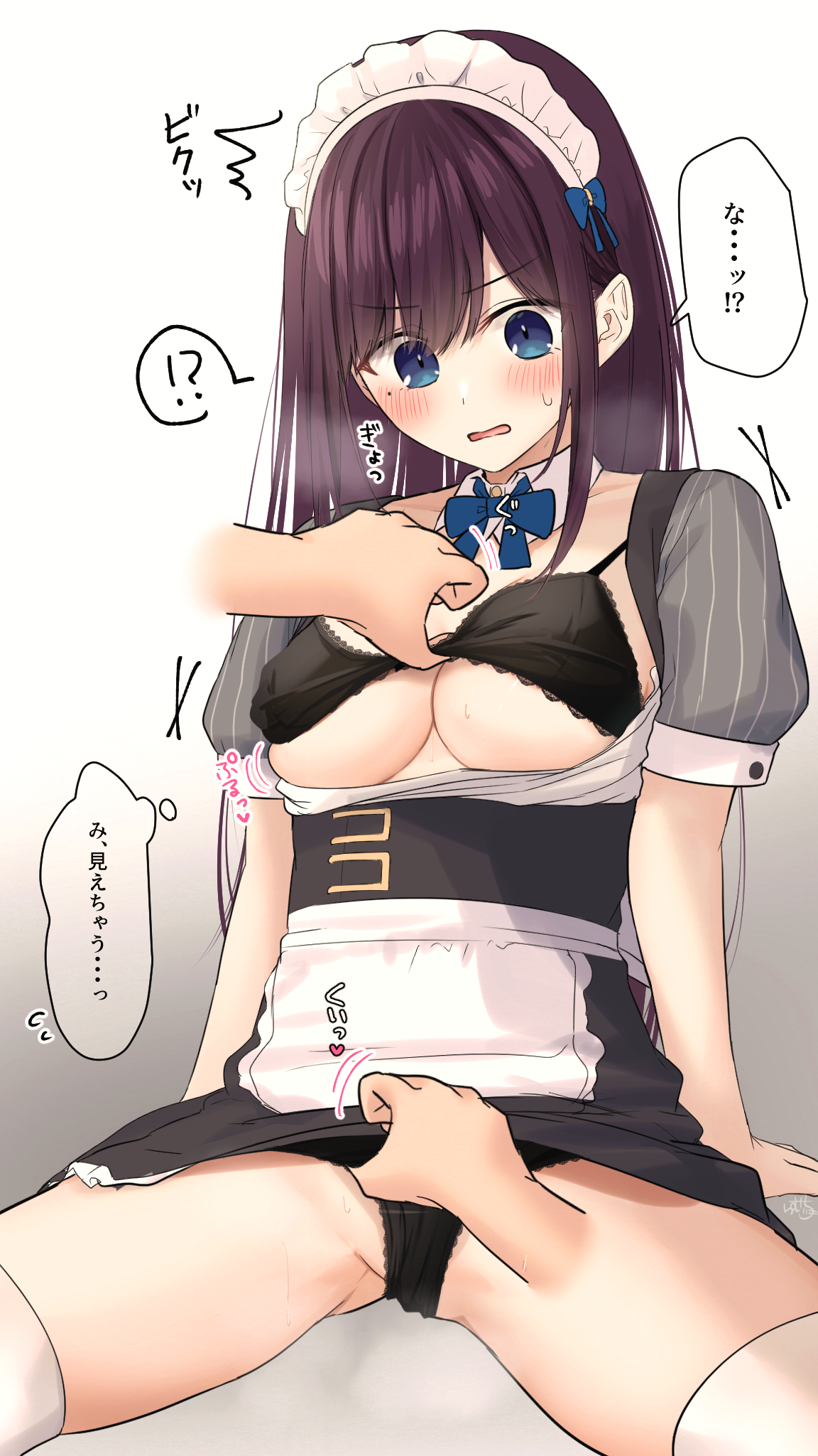 1boy1girlapronarm supportblack brablack pantiesblue eyesbrabreastsbrown haircleavagedetached collarfacing viewerlong hairmaidmaid apronmaid headdressmedium breastsmolemole under eyepantiesparted lipspulling another's clothespurple hairshort sleevessidelockssittingsolosound effectsspeech bubblespread legssurprisedsweatswept bangsthighhighsthought bubbleunderboobunderwearwhite thighhighs