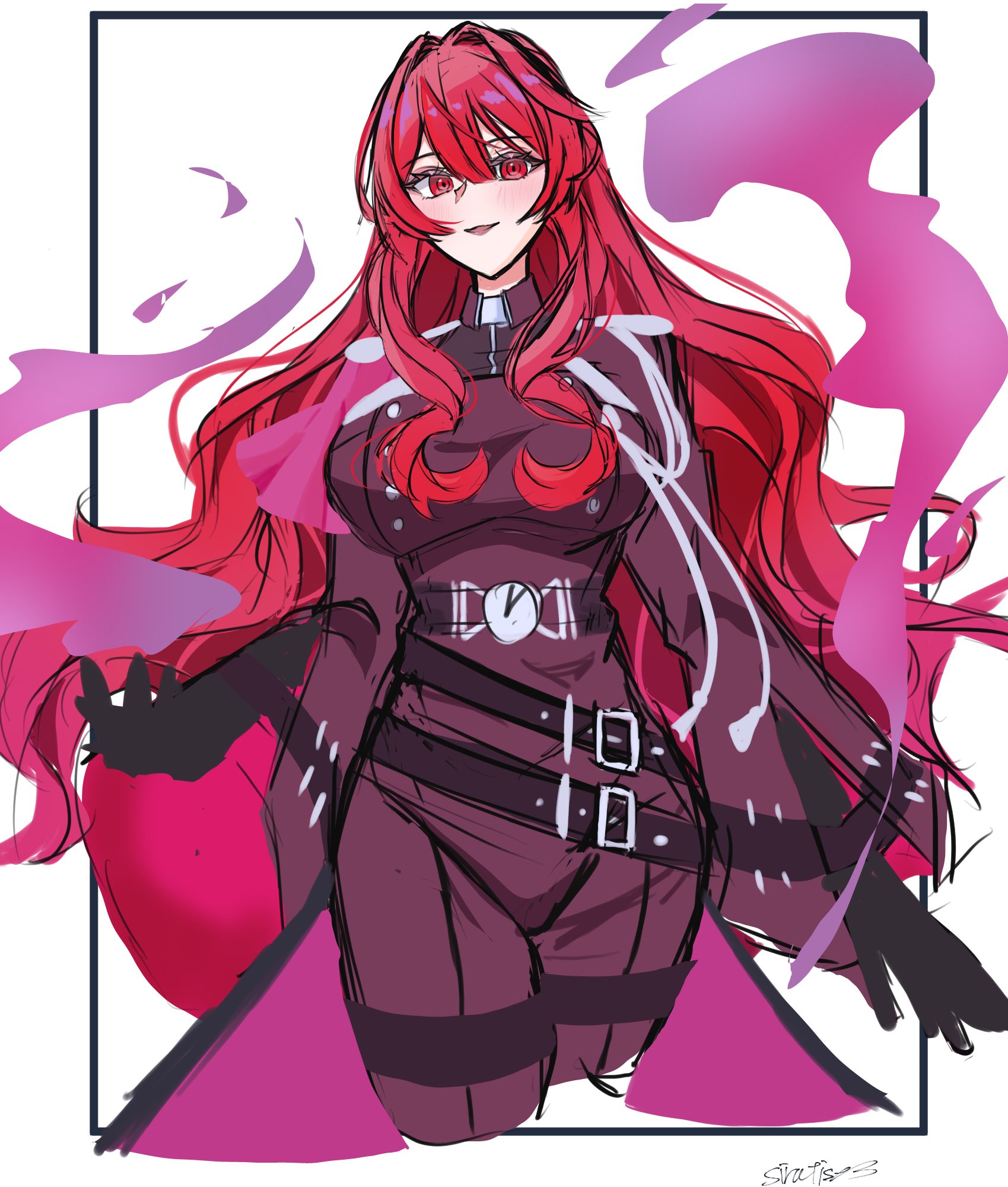 1girlbeltbreastsbuttonsdouble-breastedduel monsterexosister karmaelglovesindex finger raisedlarge breastslong hairpantspurple eyespurple hairsolothigh beltthigh strapvery long hair