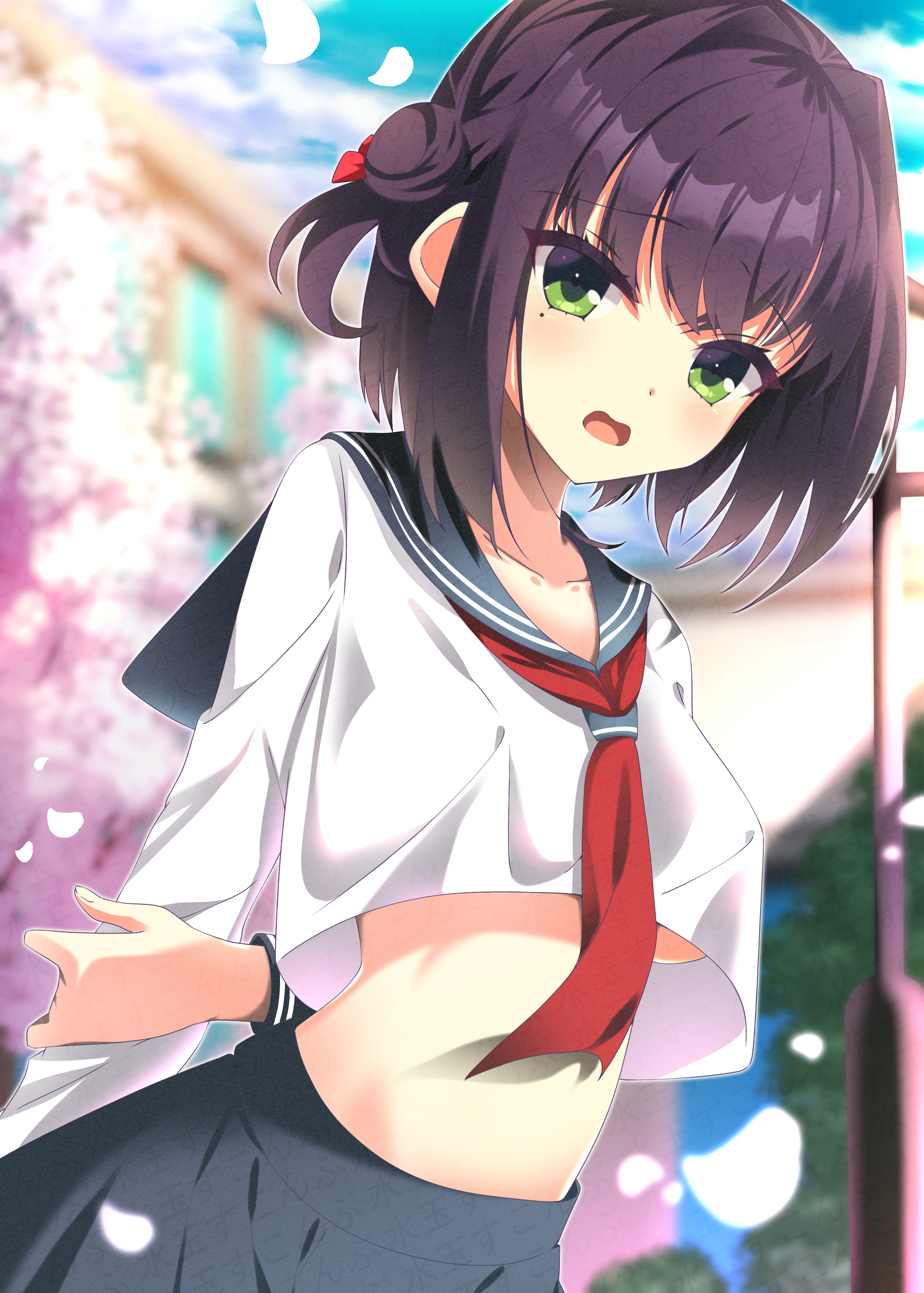 1girlalternate costumearms behind backblack hairblack sailor collarblack skirtblurryblurry backgroundblushbowbreastscherry blossomscollarbonecowboy shotcropped shirtcrossed bangsdayeyelasheseyes visible through hairfalling petalsgreen eyeshair between eyeshair bowhair bunhair intakesholding own armlong sleeveslooking at viewermedium breastsmedium hairneckerchiefno braone side upopen mouthoutdoorsoutlinepetalsred bowred neckerchiefsailor collarschool uniformserafukushirtsingle side bunskirtsolospring (season)underboobwatermarkwhite outlinewhite shirt