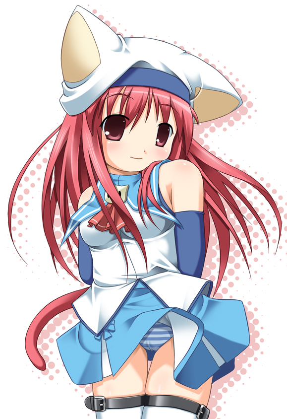 1girlanimal earsdetached sleevesfemale focuspantiesred eyesred hairskirtsolostriped clothesstriped pantiestailthighhighsunderwear