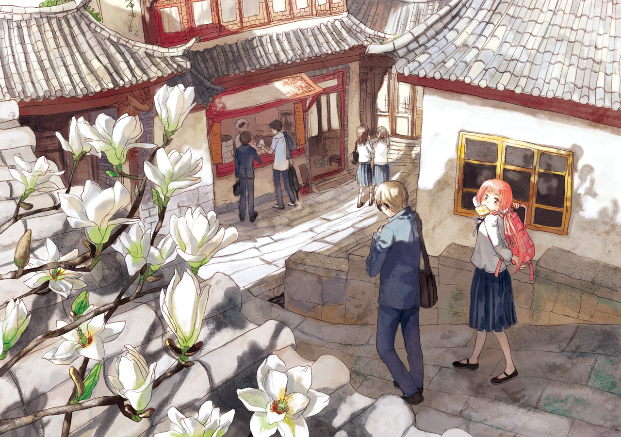 3boys3girlsarchitecturebackpackbageast asian architectureflowerglassesmultiple boysmultiple girlspink hairrandoseruschool uniformshopskirt