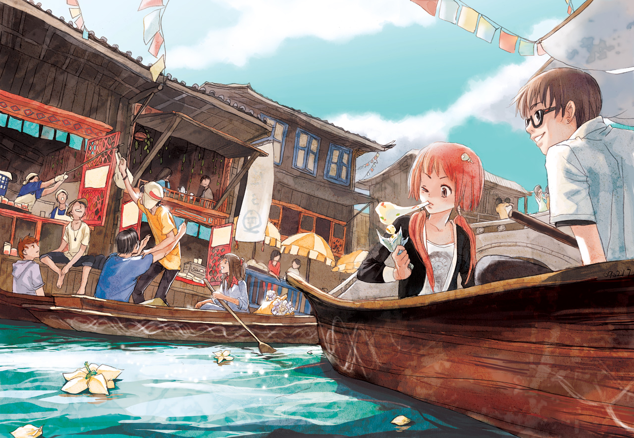 2girls6+boysarchitectureboatbrown haireast asian architectureflowerglassesmultiple boysmultiple girlsoceanpink hairshopslice of lifewatercraft