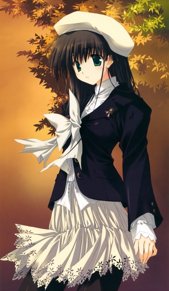 00s1girlascotautumn leavesberetbrown hairfemale focusfrillsgreen eyeshatleaflong hairpantyhoseparted lipssolo