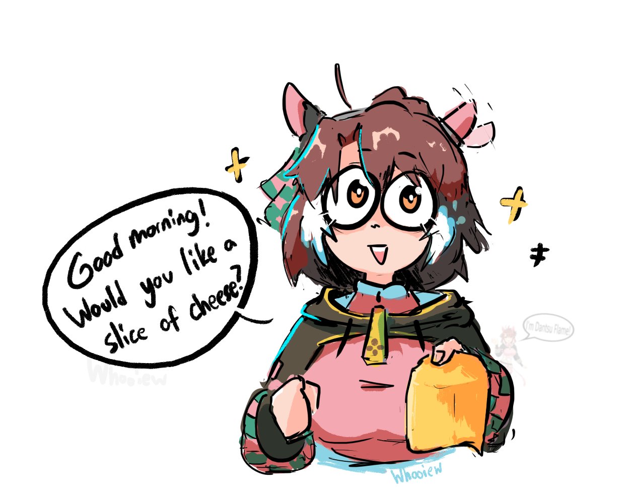 1girlahogeanimal earsblack shrugbowbreastsbrown eyesbrown haircheckered ribboncheeseear coversear ornamentear ribbonenglish textfoodhair between eyeshorse earshorse girllarge breastslong sleeveslooking at viewermulticolored hairopen mouthpink shirtshirtshrug (clothing)simple backgroundsmilesolospeech bubblestar (symbol)upper bodywhite backgroundwhite hairwhite shirt