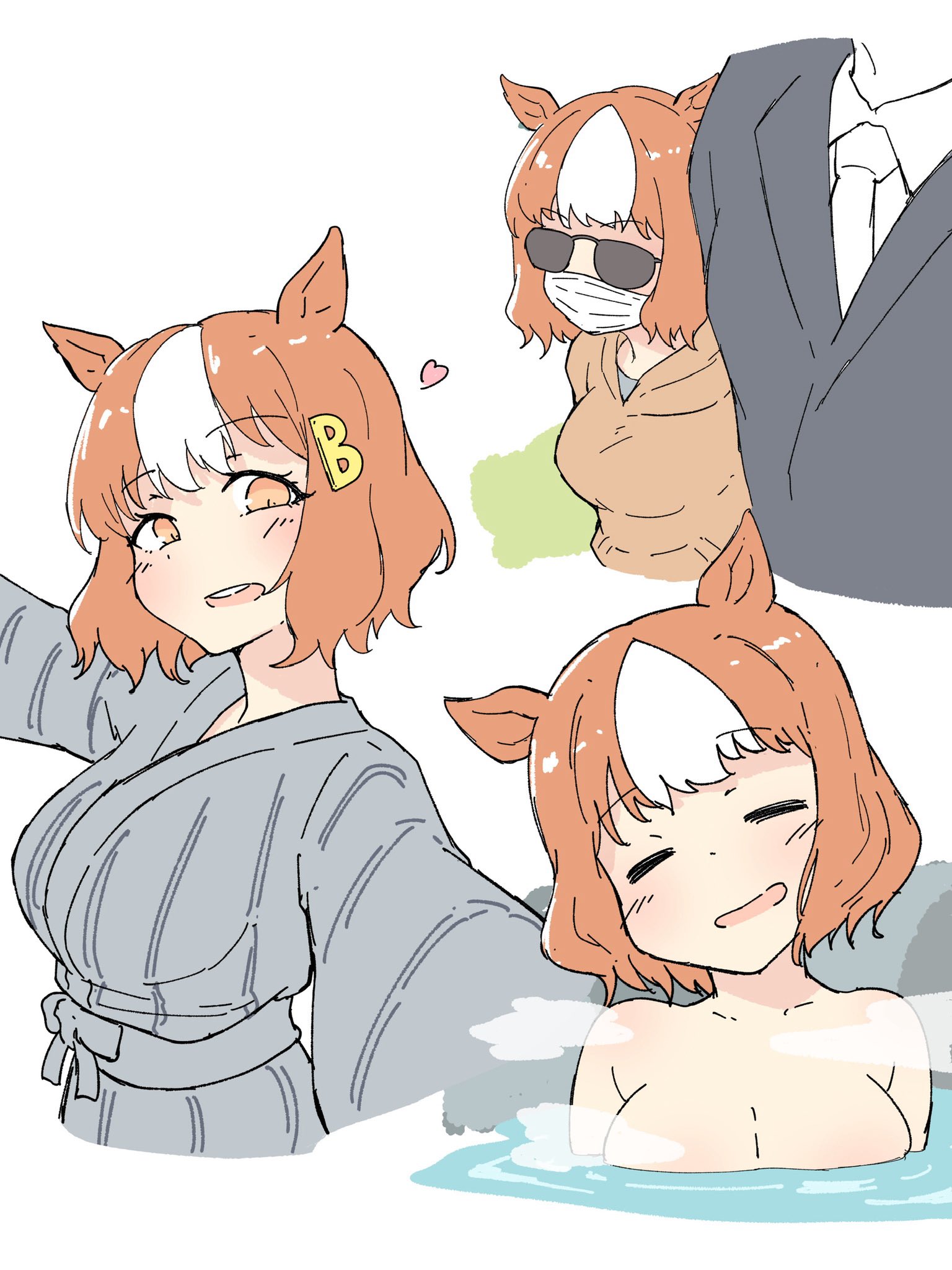 1boy1girlanimal earsbare shouldersblack maskblushbreastsbrown hairbrown hoodieclosed eyescollarboneformal clothesgrey kimonohair ornamenthearthoodhoodiehorse earshorse girljacketjapanese clotheskimonolarge breastsletter hair ornamentmaskmouth maskmulticolored hairnecktieonsenopen mouthshirtshort hairsmilesuitsunglassestwo-tone hairwaterwhite hairwhite shirtyukata