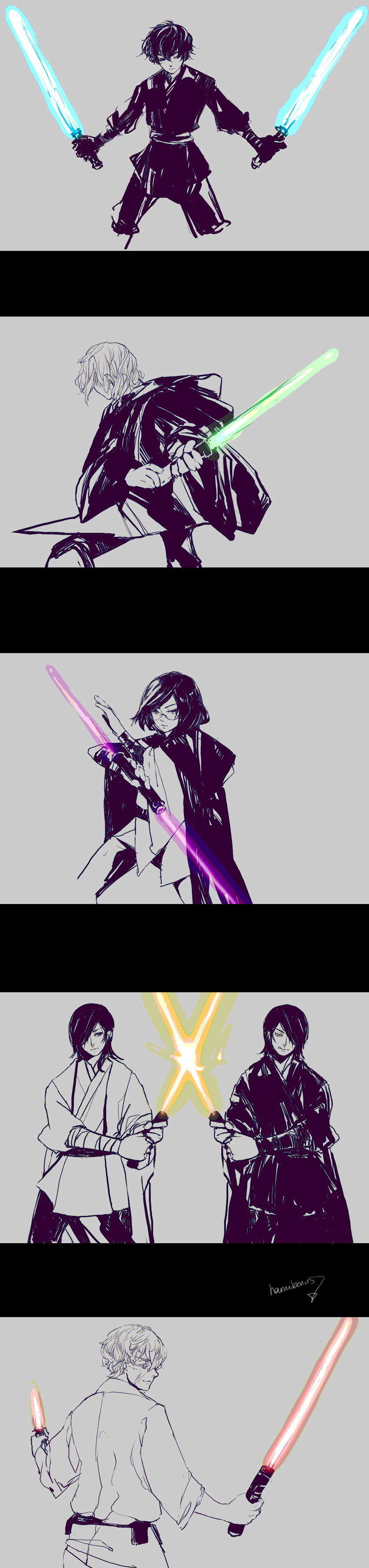akii 0915, 25-ji kaito, kaito (vocaloid), vivid bad squad kaito, project sekai, vocaloid, commentary request, 2boys, aged down, blue eyes, blue hair, blue jacket, carrying, closed eyes, closed mouth, hair behind ear, jacket, jacket on shoulders, long sleeves, looking back, male focus, multiple boys, parted bangs, piggyback, shirt, sleeping, smile, upper body, white shirt