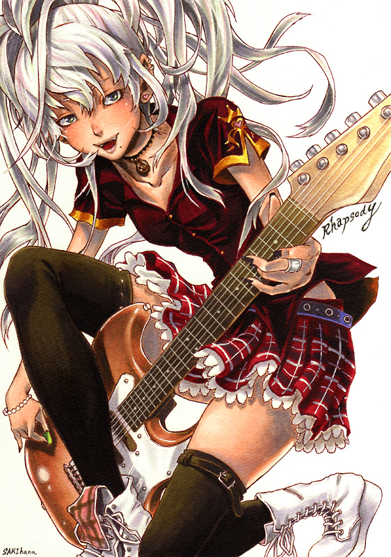 1girlartist nameblack thighhighsbootsbraceletbuckleear piercingearringsfemale focusgrey eyesguitarheartheart earringsinstrumentjewelrylace-up bootsmolemole under mouthnail polishpiercingplaid clothesplaid skirtringsimple backgroundskirtsolothighhighswhite backgroundwhite bootswhite hair