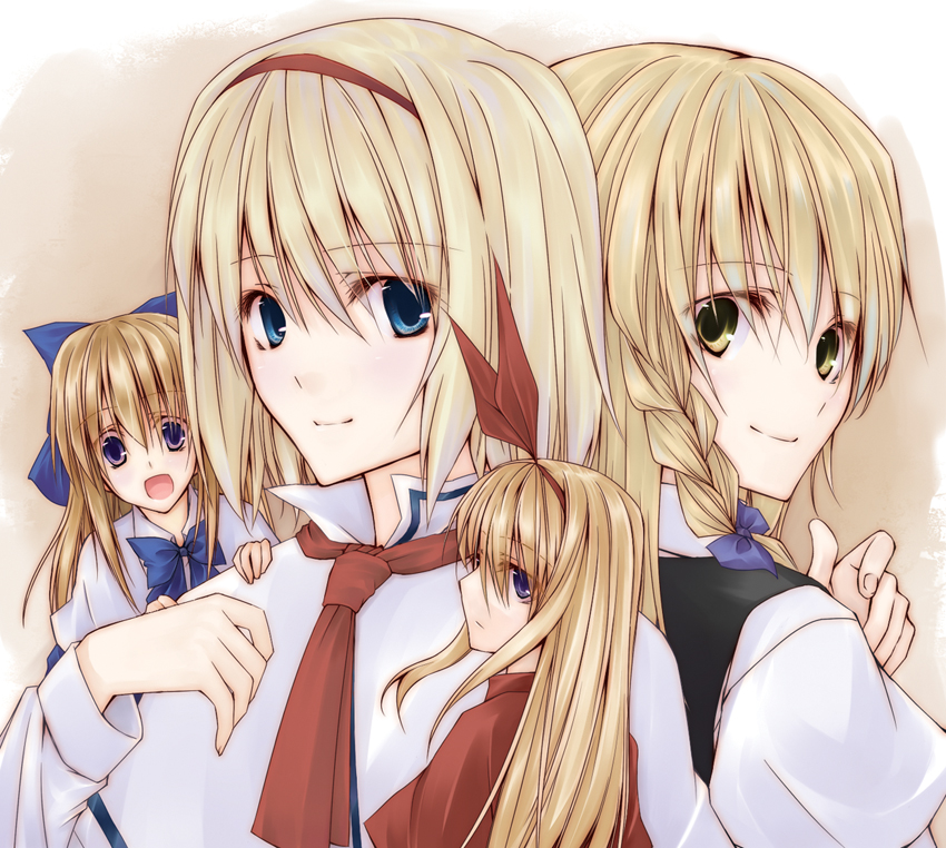 2girlsblonde hairblue eyesbraiddollfemale focushairbandlong hairmultiple girlsribbonshort hairyellow eyes