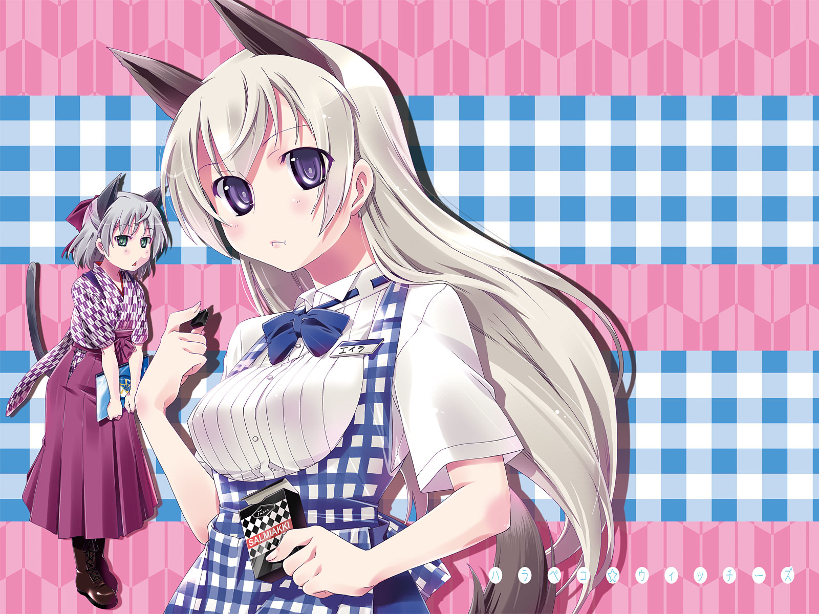 00s1boy2girlsanimal earsarrow printblue eyesbootscandycat earscat taildresseatingfoodgreen eyesjapanese clotheslong hairmultiple girlsprint dressproduct placementsalmiakkishort hairtailwaitressyagasuri