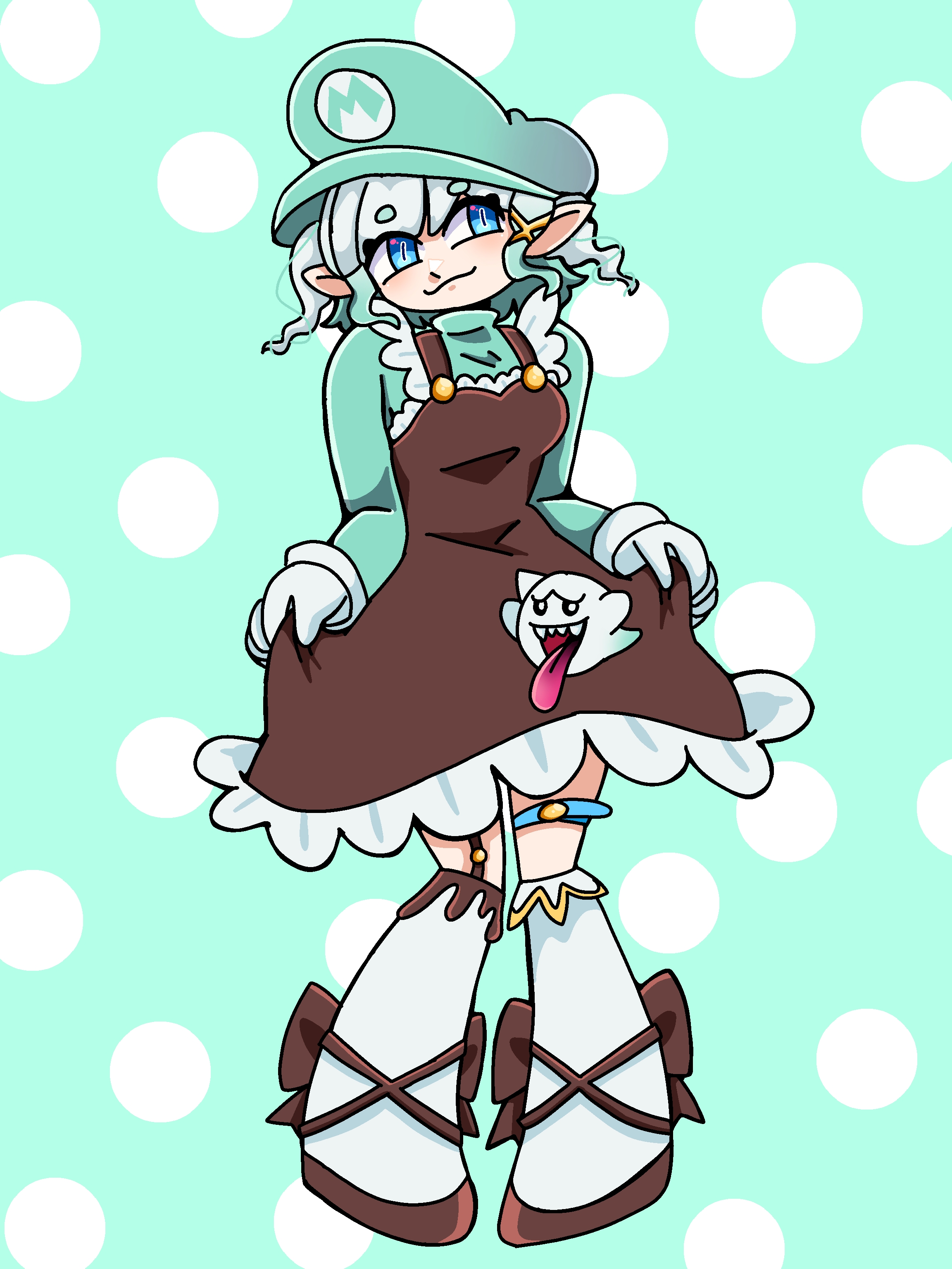 blue eyesfrillsghosthatmaidoverallspointy earspolka dotpolka dot backgroundsockstoon (style)white hairwhite socks