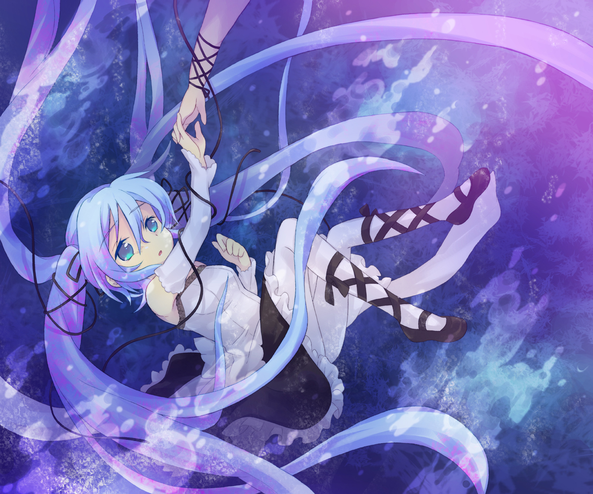 1girlaqua eyesaqua hairdetached sleevesfemale focusholding handslong hairribbonskirtsolosolo focustwintailsvery long hair