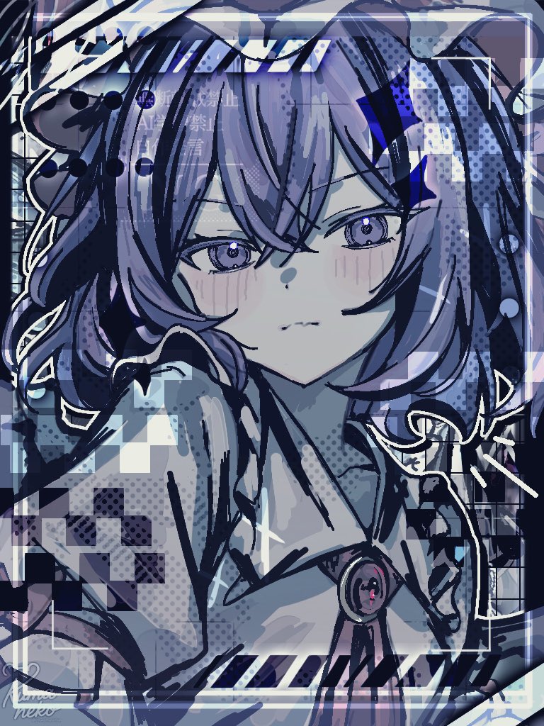 1girl69onascotblue eyesblue hairhair between eyeshatlooking at viewermob cappuffy short sleevespuffy sleevesred ascotshort hairshort sleevessoloupper body
