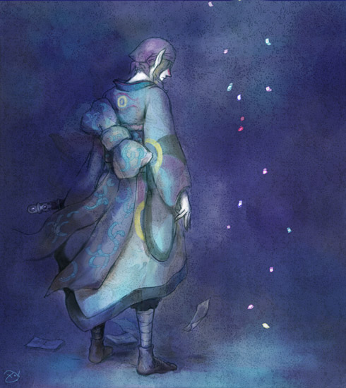 00s1boybandanablue themebrown hairfacepaintfallingfrom behindjapanese clotheskimonolooking downmakeupmale focusobiofudapaperpointy earssashsheathsheathedsockssolostandingswordweapon