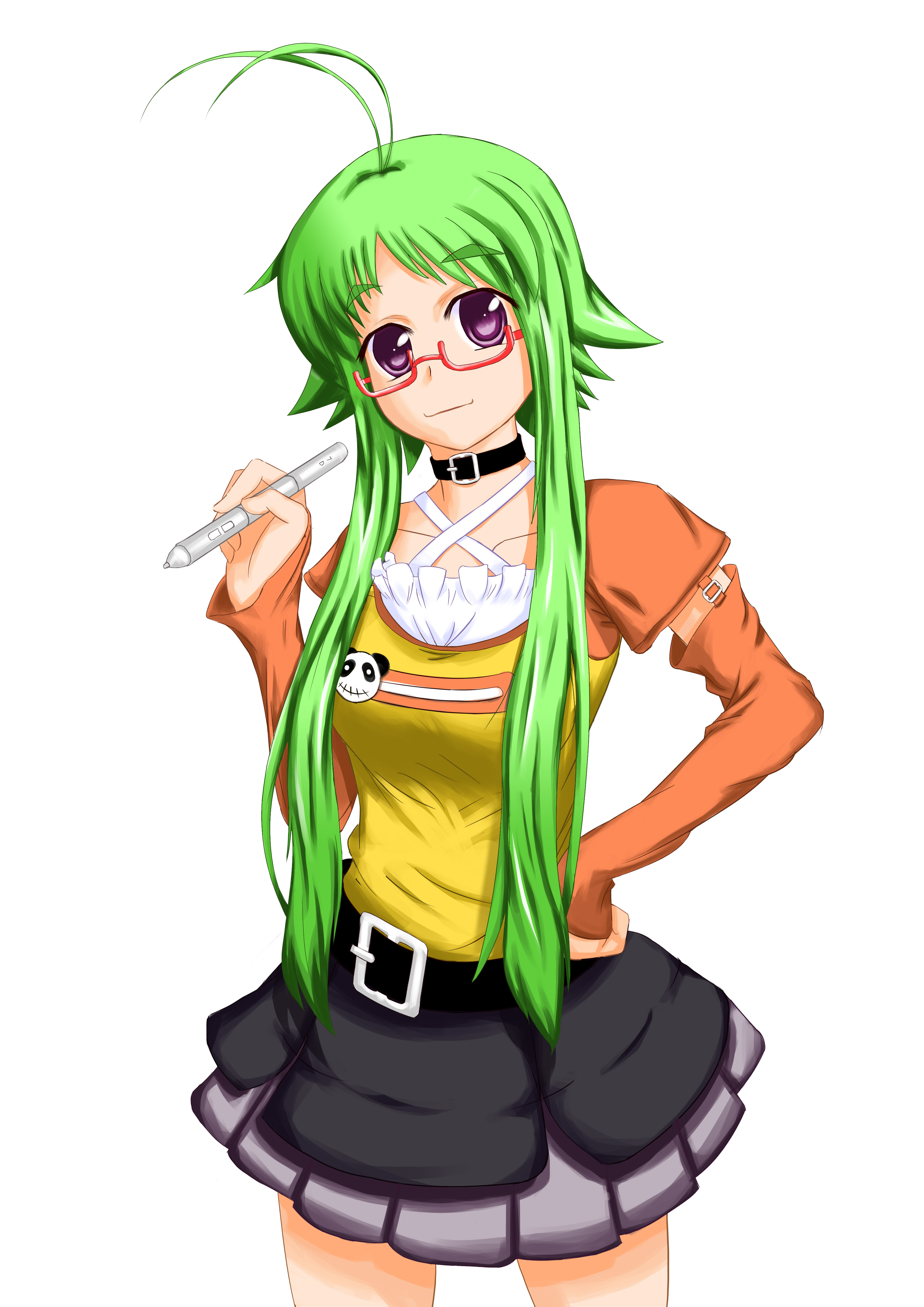 00santenna hairglassesgreen hairhand on own hiphip focuspurple eyesshort hair with long locksskirtsolo