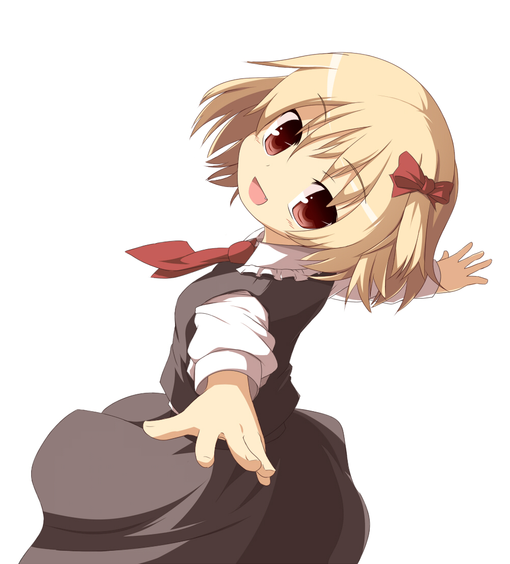 1girlblonde hairfangfemale focushair ornamenthair ribbonred eyesribbonshort hairsimple backgroundsolostandingwhite background