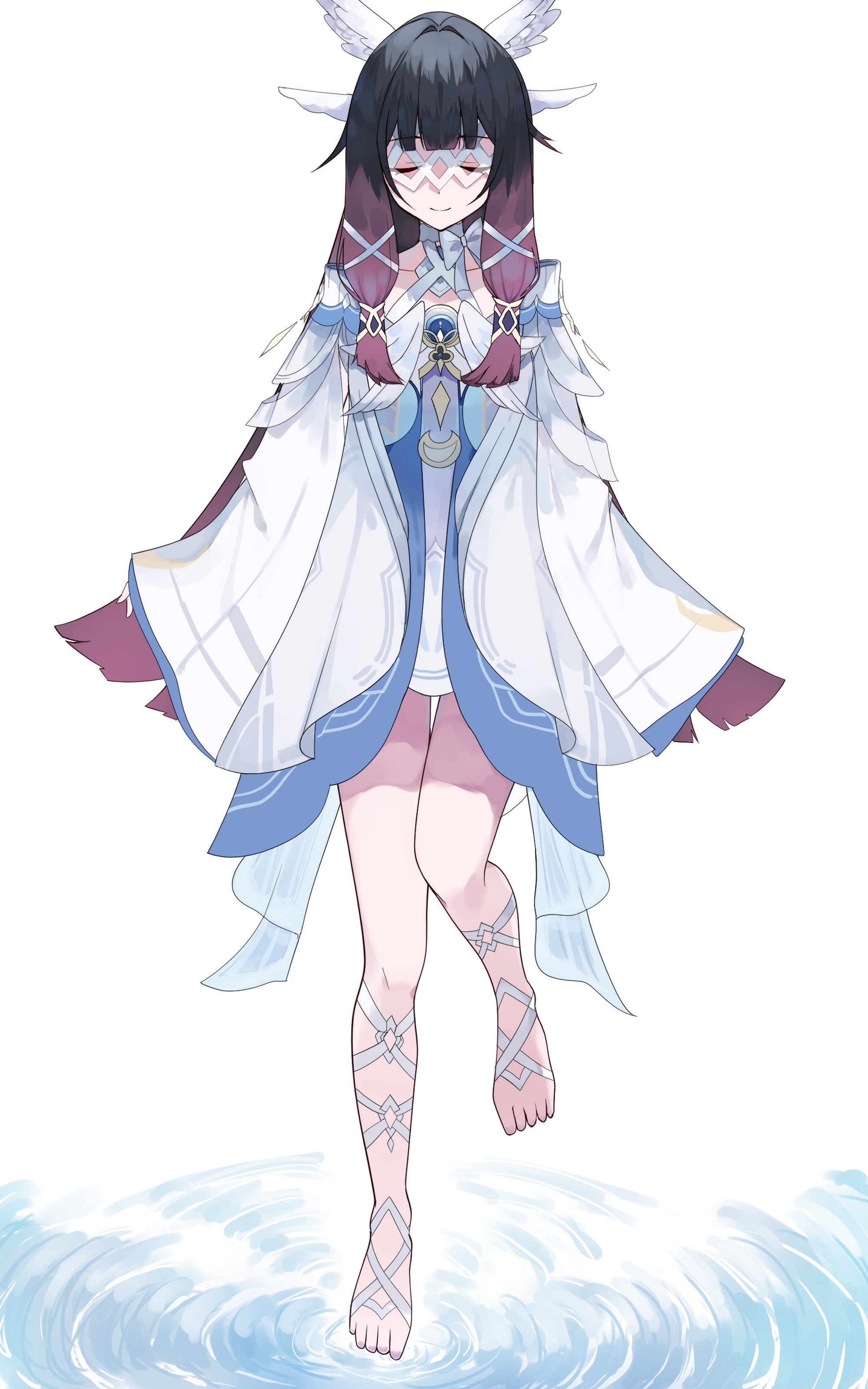 1girlbarefootblack hairbowclosed eyesdresseye maskfacing viewerfull bodyhair ribbonhead wingslong hairlong sleevesmaskmulticolored hairpink hairribbonsleeves past wristssmilesolostandingstanding on liquidtwo-tone hairvery long hairwaterwhite backgroundwhite bowwhite dresswhite ribbonwhite wingswide sleeveswings