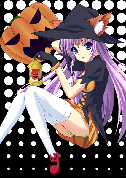 1girlanimal earscat earsfemale focusgloveshalloweenhatpantiespurple eyespurple hairsolothighhighsunderwearwitch hat