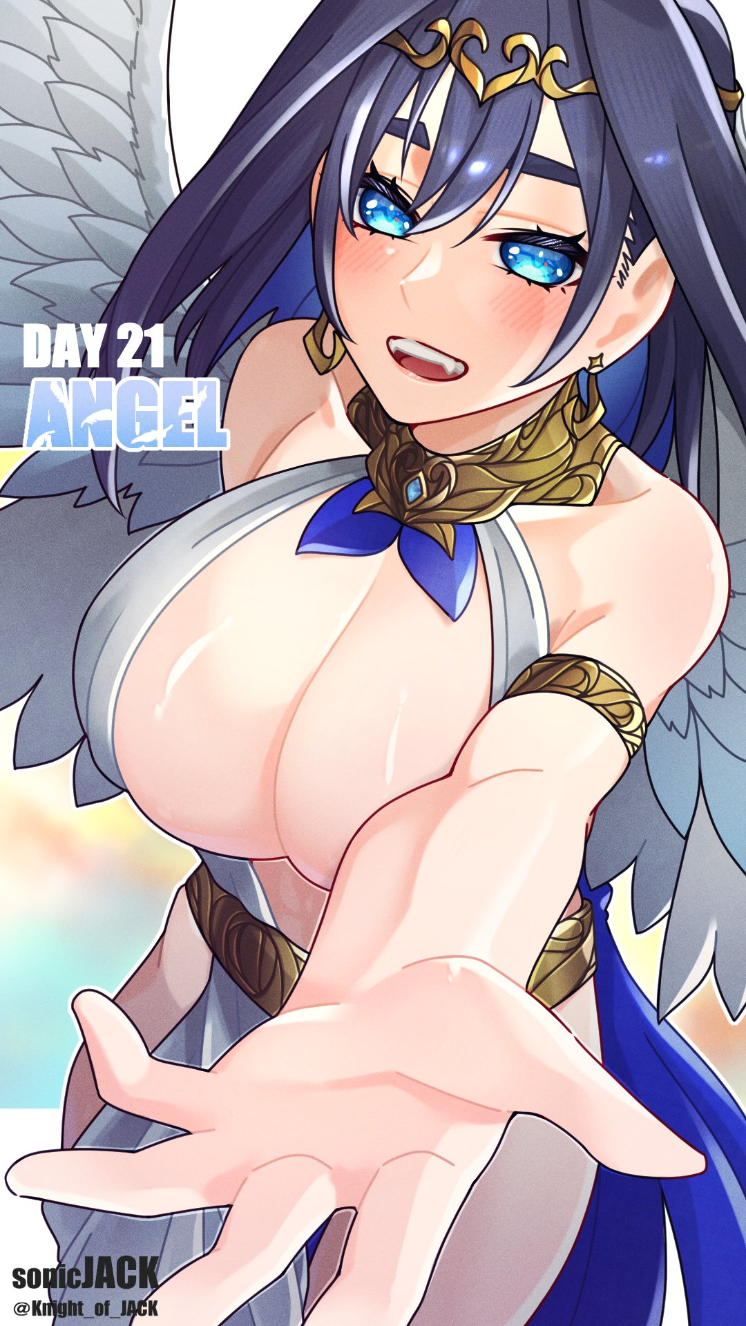 1girlangelangel wingsarmletblue eyesblue hairbreastscleavagefeathered wingsgold tiarajewelrylarge breastslooking at viewershort hairsolovirtual youtuberwhite wingswings