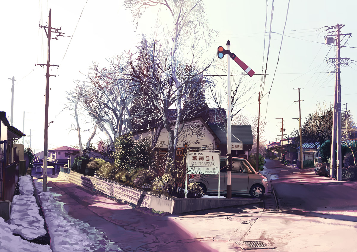 carhousemotor vehicleno humansphotorealisticpower linesreal world locationrealisticroadscenerysnowstreettraffic lighttreevanvanishing point