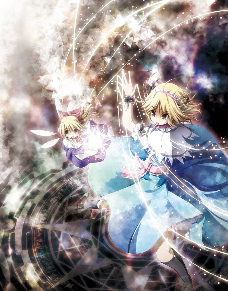 2girlsblack socksblonde hairblushblush stickerscapeletfemale focusfighting stancehairbandkneehighsmagicmagic circlemultiple girlsopen mouthshort hairsocksstringwrist cuffs