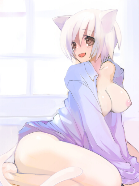 1girlanimal earsbreastsbrown eyescat earscat tailfemale focuslarge breastsshort hairsolotailwhite hair