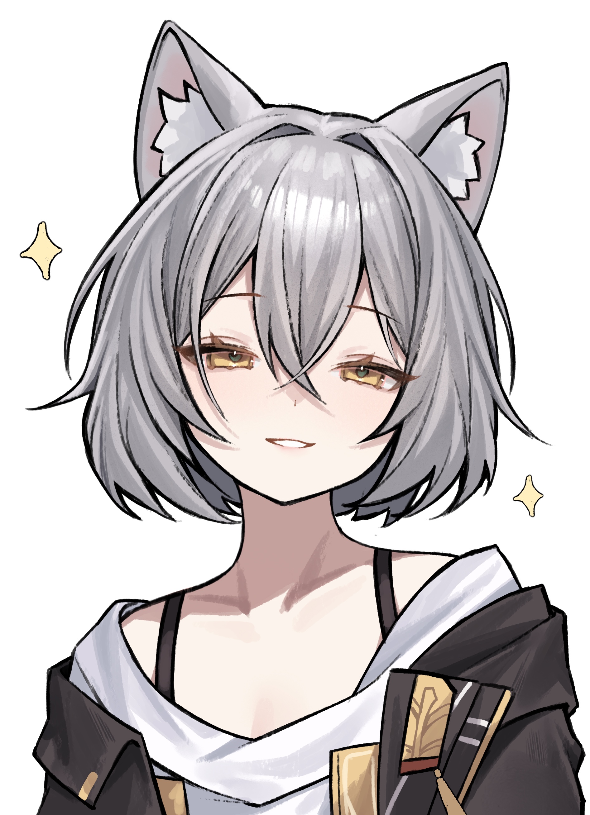 1girlalternate hairstyleanimal ear fluffanimal earsblack jacketcat earsfour-pointed stargrey hairhair between eyeshair intakesjacketlooking at vieweropen mouthportraitshirtshort hairsmilewhite backgroundwhite shirtyellow eyes
