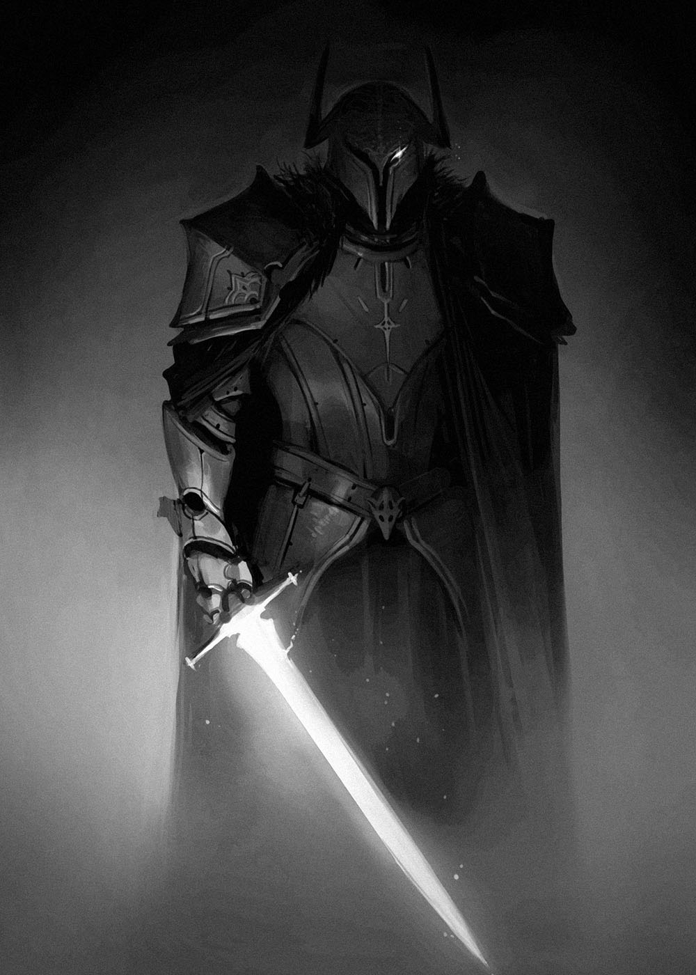 1otherambiguous genderarmorbreastplatecapefake hornsfull armorgauntletsglowingglowing eyeglowing swordglowing weapongreyscalehelmhelmetholdingholding swordholding weaponhorned helmethornsknightlooking at viewermonochromepauldronsshoulder armorsolostandingswordweapon