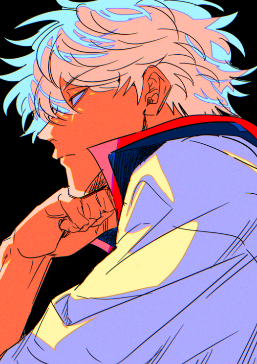 1boyarm upblack backgroundblack shirtclosed mouthfrom sidefrownhair behind earhead restjapanese clotheskimonomale focusparted bangspopped collarprofilered trimsanpakushirtsimple backgroundsoloupper bodywhite hairwhite kimono