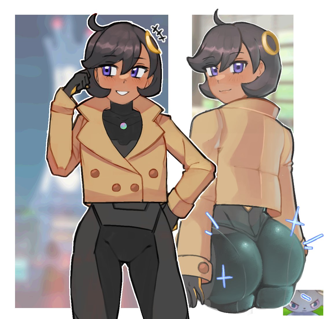 1girlassblack bodysuitblack hairblushbodysuitbodysuit under clothesbrown jacketdark skindark-skinned femalefrom behindgen 6 pokemongloveshair ornamentjacketlooking at viewerpokemon (creature)purple eyesshort hairsmilesolo